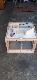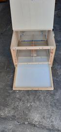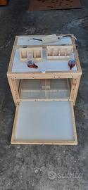 Incubatrice/cassetta termica con lettiera, di fattura artigianale per piccoli volatili (quaglie-merli, ecc.) corredata di due abbeveratoi e due mangiatoie. Il riscaldamento avviene tramite due lampade, ad intensità regolabile, opportunamente protette. Dimensione 55x55x40 cm. Contatti solo via e-mail