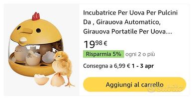 vendo incubatrice automatica uova comprata su amazon a 20 euro mai usata vendo a 15 euro Design Sicuro: Realizzata con materiale ABS di alta qualità, questa incubatrice garantisce sicurezza e durata, ideale per ambienti domestici e scolastici. Progettata per resistere all'usura quotidiana, offre prestazioni affidabili nel . È una scelta eccellente per chi cerca un prodotto pratico e funzionale per l'incubazione delle uova. La sua struttura garantisce stabilità e sicurezza, rendendola adatta a diverse esigenze. Perfetta per chi desidera un prodotto affidabile per uso pers Compatibilità versatile:Facilita il monitoraggio di più fasi di vita per uova di gallina, e altri , garantendo compatibilità con diverse specie. Questo incubatore versatile è progettato per soddisfare efficacemente esigenze variegate. Un flessibile che permette di ottenere risultati costanti per diversi tipi di uova, rendendolo strumento essenziale per appassionati e allevatori. climatico avanzato: l'efficienza di schiusa con una manutenzione affidabile della temperatura a 37,8C integrando controlli intelligenti e una distribuzione uniforme del flusso d'aria per eliminare le zone calde durante il processo di incubazione garantendo risultati migliori per ogni batch di uova Strumento Educativo Pratico: Promuove l'esplorazione dei concetti della scienza della vita suscitando l'interesse dei bambini attraverso l'apprendimento interattivo, funzionando come una risorsa educativa indispensabile per attività didattiche domestiche e scolastiche che enfatizzano lo sviluppo della conoscenza esperienziale tramite l'uso pratico 'incubatrice per uova Compatto e a basso consumo: Alimentato tramite interfaccia di tipo C, questo incubatore di uova consuma solo 9W, offrendo dimensioni compatte ideali per scrivanie e aule mantenendo prestazioni affidabili con un uso minimo di energia per soddisfare le esigenze degli utenti consapevoli