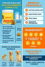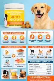 Un integratore completo pensato per il benessere quotidiano del cane. La combinazione di vitamine, minerali e nutrienti naturali aiuta a mantenere energia, vitalità e una buona forma generale.