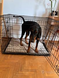 Vendo kennel dimensioni 106cm di larghezza e 77cm di altezza e profondità 71cm Marca Lionto, su amazon pagata 98 La modella di 8 mesi pesa 30 kg è lunga 80cm e alta 70 cm al garrese e ci sta largamente sia sdraiata che in piedi :) Siamo a padova ma possiamo spedire, il dobermann non è in vendita 😂