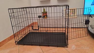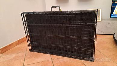 Kennel in acciaio e contenitore in plastica colore nero. Richiudibile con maniglia. Misure 57 cm di larghezza, 62.5 cm di altezza, 90 cm di lunghezza.