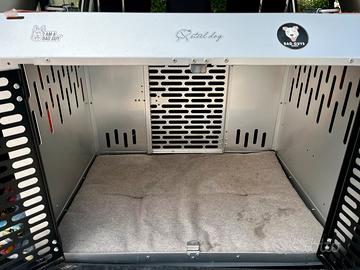 Vendo un kennel marca steel dog nel modello baita (85×60 H 65) in alluminio in due colorazioni (argento- nero) con doppia chiusura e porta posteriore di emergenza. Al momento è inserito in una Suzuki Gran Vitara. Vendo comprensivo di cuscino omologato per le dimensioni del trasportino. Uniche imperfezioni: piccolo graffio sul posteriore (lato vicino ai sedili) e piccola ammaccatura sul lato anteriore sx sul davanti. Entrambe non compromettono minimamente l'utilizzo del kennel. Prezzo trattabile