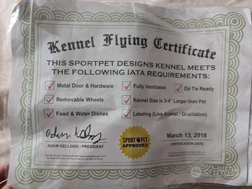 Kennel per trasporto cani di grande taglia, utilizzato solo per un viaggio aereo, ciotole acqua, 4 ruote. Apertura a Press d'aria in metallo. Manca solo una maniglia nera.