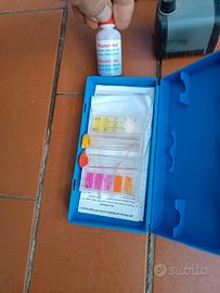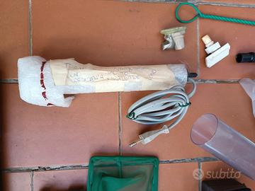 Kit x acquario con: reti x pesci, n.2 pompe x acqua, n.2 tipi di kit pulizia vasca, kit analisi acqua, termometro x acquario, carbone attivo x filtri e altro.