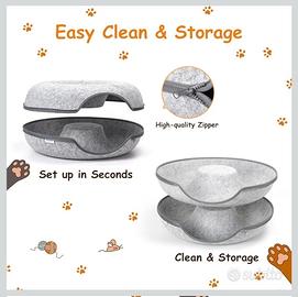 È una cuccia molto spaziosa e robusta, pensata sia come rifugio interno sia come lettino superiore. Il design “a ciambella” mantiene la forma e offre al gatto un ambiente raccolto, caldo e protetto.