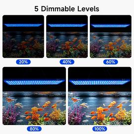 【3 modalità di illuminazione e 5 livelli dimmerabili】 Lampada acquario è fornita con un telecomando con il quale puoi regolare la luce per il tuo acquario comodamente dal tuo divano. 3 diverse modalità di illuminazione (bianco/blu/bianco con luce blu), 5 livelli di dimmerazione, tutti impostabili tramite telecomando, in modo da poter regolare l'intensità della luce e lo spettro lampada acquario.