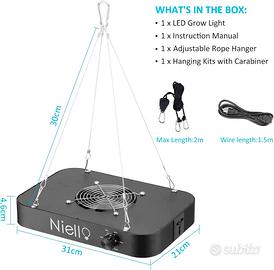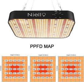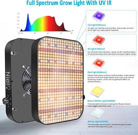 Niello lampada per piante, 1200W lampada da coltivazione con IR, UV High PPFD Sunlike Full Spectrum luce per piante per Indoor Veg and Bloom, funzione dimmerabile e catena a margherita [Classe di efficienza energetica F] Spettro Completo Ottimale: Questa lampada LED per piante offre uno spettro completo con luce bianca, rossa, IR e UV (3000K, 5000K, 660nm, IR 760nm e UV 395nm). I diodi da 3000K emettono una luce rossa intensa, mentre quelli da 5000K forniscono una luce blu. La combinazione di luce rossa e IR a 660nm è particolarmente utile per stimolare la fioritura, migliorando la resa e accelerando i tempi di crescita. La luce UV a 395nm contribuisce a mantenere le piante in salute, offrendo un'illuminazione che appare naturale e benefica (led per piante) Design dimmerabile e funzione Garland: le luci di crescita di aggiornamento hanno solo un pulsante di regolazione, che viene utilizzato non solo come funzione di regolazione, ma anche come interruttore della luce. Facile da usare. Multi-Lights con un massimo di 8 unità possono essere collegati tramite una funzione Daisy Chain. Tuttavia, è necessaria solo una presa e puoi regolare ciascuna luce in modo indipendente (luce per piante) Risparmio Energetico e Prestazioni Eccellenti: Dotata di 584 LED di alta efficienza, questa lampada per piante da 1200 W consuma solo 130 watt di potenza, riducendo i costi energetici del 50% rispetto ad altre lampade LED. La copertura è ottimale per la fase vegetativa con un'area di 90 x 90 cm, garantendo una crescita vigorosa e sana delle tue piante Costruzione Robusta e Raffreddamento Efficiente: La nostra lampada LED da 1200W è equipaggiata con due ventole di raffreddamento ad alta velocità e un dissipatore di calore in alluminio, assicurando una gestione termica eccellente e prolungando la durata della lampada. Una scelta robusta e affidabile per ogni tua esigenza di crescita (lampada led piante) Acquista con fiducia: forniamo un servizio clienti 24 ore su 24, 7 giorni su 7. Se no