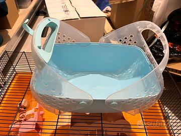 Vendo lettiera ampia dotata di due beverini, due portafieno (marca septillar) , una ciotolina e un trasportino in perfette condizioni.