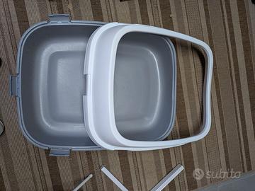Capiente vaschetta igienica per gatti, ideale anche per razze di taglia grande (come Maine Coon o Ragdoll) grazie alle sue dimensioni generose. La struttura è composta da una base grigia robusta e un bordo superiore bianco rimovibile tramite pratiche clip laterali. Il design a bordo alto è perfetto per contenere la sabbia ed evitare fuoriuscite, mentre l'ampia superficie offre al gatto il massimo comfort e libertà di movimento. Facile da smontare e lavare. Caratteristiche principali: Dimensioni: 65 x 52 cm Colore: Grigio e Bianco Materiale: Plastica resistente di alta qualità Stato: [Inserisci qui: Es. Nuovo mai usato / Ottimo stato] Plus: Sistema a clip per fissare eventuali sacchetti igienici.