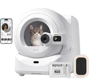 Lettiera autopulente con telecamera e monitoraggio gatti, top di gamma, AI, notifiche e report su app smartphone, nuova ed imballata. Filtra e pulisce la sabbia, monitora e registra ogni attività igienica di più gatti, tipo di rifiuti, permanenza in lettiera, frequenza, produce report video e foto, ed imballa i rifiuti in sacchetti sigillati.