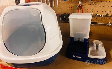 Lettiera blu per gatto taglia medio-grande con paletta inclusa e spazio per inserimento del filtro odori. L’interno è usurato dalla sabbietta non sporco. Incluso con la lettiera c’è il distributore di crocchette e acqua manuale. Contattare per ulteriori informazioni.