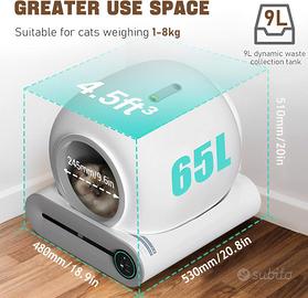 Lettiera autopulente con applicazione: la lettiera autopulente per gatti è collegata al Wi-Fi 2,4 GHz. Puoi monitorare il peso e l'attività del tuo gatto in tempo reale. Usando il tuo cellulare, puoi eseguire una serie di funzioni, come la pulizia della lettiera per gatti e la purificazione dell'aria.