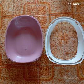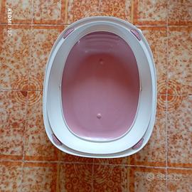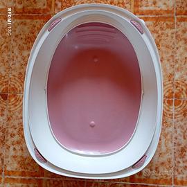Lettiera per gatti modello Shuttle di Georplast, rosa, con una lunghezza di 45 cm. Il design è ovale e presenta un bordo bianco rimovibile per facilitare la pulizia o mettere sacchetto. • Plastica resistente con bordo alto per la sabbia