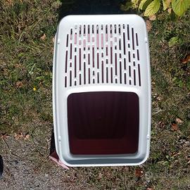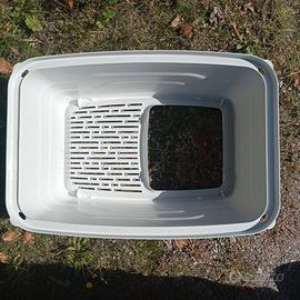L'ingresso del micio è dall'alto, ed è ben chiusa di lato, così c'è ricambio d'aria (e il micio è contento) e la sabbietta non viene lanciata fuori (e sono contenta anche io!).