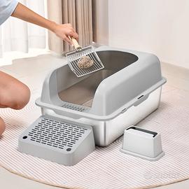 Inodore e facile da pulire: il coperchio superiore e la vaschetta sono fissati saldamente con un collegamento a scatto per evitare perdite. Le pareti alte e curve eliminano le aree difficili da raggiungere, assicurando che non rimanga lettiera per gatti negli angoli. Inoltre, è inclusa una paletta di metallo a manico lungo per una maggiore praticità.