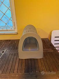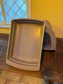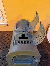 lettiera estraibile, si pulisce facilmente, ha la maniglia per spostarla comodamente, due piccoli scompartimenti e una paletta per raccogliere i bisogni. il fondo è leggermente rovinato, si nota nell’ultima foto.