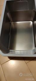 Base in acciaio e parte sopra in plastica,ingombro massimo in lunghezza 50 cm, ingombro massimo in larghezza 35 cm,altezza totale 30 cm,altezza della sola vasca in acciaio 15,5 cm.