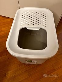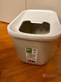 Spaziosa toilette per gatti grandi Savic Hop In con ampia entrata dall'alto, ribalta perforata rimovibile e calpestabile, ermetica, facile da pulire, Made in Europe. Mis.: L 58 x P 38,5 x H 39,5 cm
