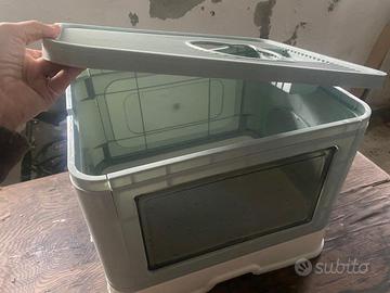 Lettiera per gatti chiusa, con sportello davanti per entrare ed apertura sopra per uscire provvista di cassetto estraibile, misure 40 cm per 40 cm, altezza 45 cm