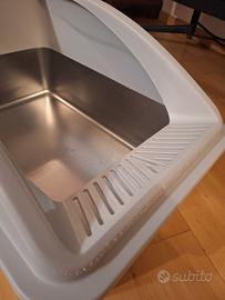 Lettiera per gatti in acciaio inossidabile, taglia XL, senza coperchio, antiaderente e antigoccia, facile da pulire. Usata un anno, l'acciaio è in condizioni ottime; il bordo in plastica ha graffi come in figura. Lavata con aceto e acqua bollente. Utilizzabile con o senza bordo. Prodotto funzionale e consigliato. Adatto sia a cuccioli che a gatti grandi.