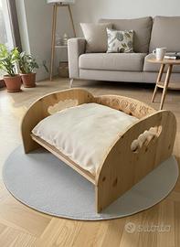 Lettino per cagnolini di taglia media, in legno di abete, finemente traforato con cuori e incisioni. Compreso di cuscino con tessuto di cotone, sfoderabile (munito di cerniera)