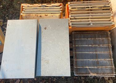 Vendo Lotto Materiale per Apicoltura. Il lotto è composto da: 40 escludi regina in acciaio per arnie Dadan Blatt da 10 telaini 14 Nutritori a tasca Quarti/Lega 2 Arnie in Polistirolo con coperchio in metallo e con 5 telaini nuovi (senza foglio cereo e ancora da zigrinare). Vendo il lotto SOLO ed esclusivamente in blocco. Astenersi perditempo, sognatori ed affaristi. Ritiro solo ed unicamente a mano. Grazie.