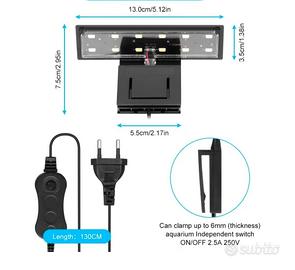 Luce per acquario di lunghezza fino a 45 cm circa. Con clip per vetro di max 6 mm di spessore. Colore nero. 5 W; 12 LED bianchi. Filo di 130 cm con interruttore on/off. Usata pochissimo, confezione originale. Se acquisti 2 pezzi: €13.