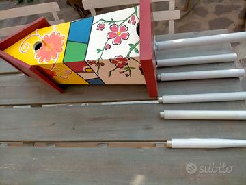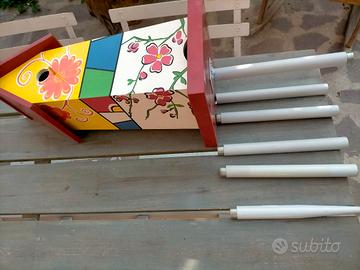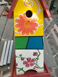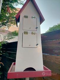 Bellissima casetta mangiatoia per uccellini da esterno. Nuova, mai usata. Dimensioni solo della casetta 23x23x h 55 cm. Può essere piantata in terra con asta smontabile. Altezza massima con asta 1,90mt