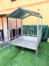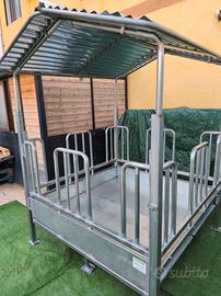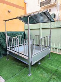 Portaballone mangiatoia per cavalli bovini vitelli misura 150x150 completa di copertura mangiatoia del tipo pesante 8 posti antisptreco porta apribile per facilitare il carico di fieno completa di copertura regolabile in altezza tutta in ferro zincato.Questo prodotto e molto pesante e voluminoso in caso di spedizione arriva smontato su pallet e per il montaggio occorrono due persone esperte,noi organizziamo una volta al mese trasporto e montaggio Sicilia Reggio Calabria,Basilicata,Puglia,Campania.whatsApp 3291561887