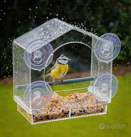 Vendo Mangiatoia per uccelli nuova, trasparente, con ventose e posatoio, misure 20 x 18 cm, da fissare su vetro o superfici lisce. Prezzo trattabile