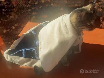 mantello per gatto in raso e pelliccetta sintetica morbida dotato di alamaro di aggancio al collo animale non incluso