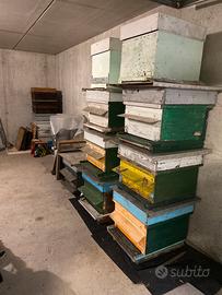 materiale apistico di vario genere: un secchio di cera da lavorare 6 kg circa, 2 arnie da 10 (2 polistirolo Quarti) da usare x recupero sciami o in emergenza, 7 da 12 con relativi melari, 4 apiscampo da 12, 4 escludi regina da 12, 1 sceratrice artigianale solare, un po’ di vasi da miele di diverse dimensioni, le cassette hanno dentro telaini alcuni infilati e altri da infilare, i melari hanno dentro telaini o da infilare o da mettere foglio cereo. 3 supporti in metallo per arnie, ciascuno da 4 cassette. Alimentatori per le cassette e separatori interni per i favi. Manuale per chi vuole iniziare. Ero iscritto all’anagrafe apistica. 1 maturatore in metallo con relativa alzata. Qualche arnia da 12 necessita di manutenzione per il fondo antivarroa. Prezzo per l’intero trattabile ma non regalo.