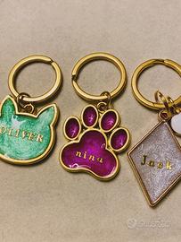 Medaglietta personalizzata per cane e gatto. Possibilità di personalizzare: forma, rifinitura, colore, charms, carattere del nome, numero di telefono.