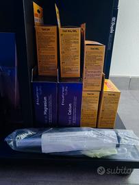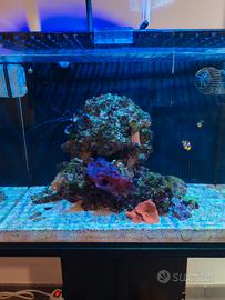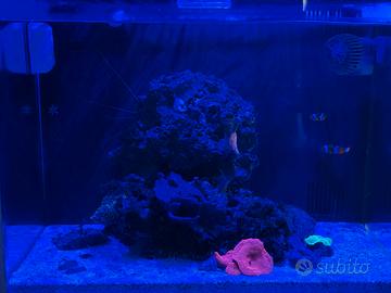 riscaldatore, schiumatoio, pompa di risalita, pompa per il rabbocco automatico, termometro, pulitore vetro, ventola per movimento acqua, lampada temporizzata con diverse tonalità di luce, rocce vive, 2 pagliacci, 1 gambero, 1 lumaca, coralli molli come da foto e una anemone, test per controllo valori acqua, cibo pesci e coralli con doppia pompetta, due taniche da 15 litri (vuote per rabbocco e cambio acqua).