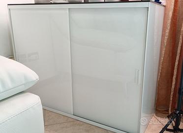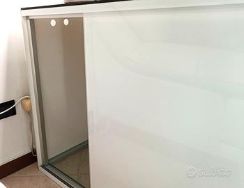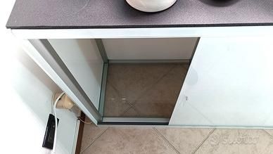 Supporto per Acquario, artigianale. Bianco, laccato lucido. Struttura in acciaio, ante scorrevoli ed asportabili. Dimensioni: L. 110 mm. P. 42 cm. H. 80 cm. €250,00. Non Spedisco