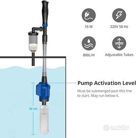 💧 Acquario sempre pulito senza fatica! 🔥 Basta acqua sporca e fatica manuale 💧 Pulizia profonda in pochi minuti 🐟 Protegge i tuoi pesci e migliora l’ambiente Funzione 3-in-1: Combina tre modalità per il ricambio d'acqua, l'aspirazione e la pulizia della sabbia. Adatto ad acquari d'acqua dolce e salata (profondità consigliata ≥ 30 cm) Regolazione del flusso: Dotato di valvola di regolazione per modificare la portata idrica (escluso tubo di uscita) Pulizia Efficiente: Grazie a una pompa ad alta prestazione, aspira efficacemente residui da radici di piante, pietre e angoli. Pulire regolarmente il filtro per evitare ostruzioni e perdita di potenza aspirante Sicurezza e durata: La girante della pompa può essere smontata manualmente. Una pulizia periodica dei depositi interni riduce lo stress sul meccanismo e ne prolunga la vita utile Facile da usare: Prima di utilizzare il prodotto, posizionare la pompa sotto una superficie orizzontale e premere l'interruttore