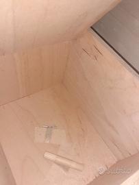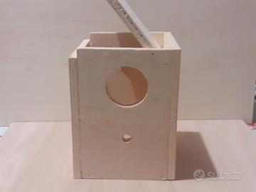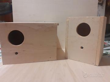 Nidi per inseparabili e cocorite, in multistrato di pioppo dello spessore di 1 cm. Nei nidi per cocorite c'è il fondo concavo per limitare il movimento delle uova durante la cova.