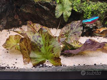 Vendo piantine nate da pianta madre di Nymphaea Lotus 'Tiger Green', una varietà rara e molto decorativa di ninfea tropicale. Le foglie presentano splendide venature verde scuro su sfondo chiaro, con un aspetto "tigrato" unico. Ideali per acquari, vasche o laghetti tropicali. Crescita rapida