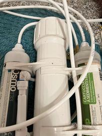 Impianto domestico per la produzione di acqua praticamente pura e totalmente priva di sali minerali (conducibilità e TDS sono pari a zero quindi) che è l' ideale per l' utilizzo in un acquario, sia esso dolce che marino. L' impianto è composto da 3 stadi successivi: cartuccia a sedimenti trasparente da 5 mcr: rimuove dall' acqua le particelle in sospensione e i residui di ruggine o particolato; se ne consiglia la sostituzione ogni 6 mesi o 3000 litri di acqua prodotta.