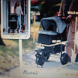 Usato una volta, ora la cagnolina non c è più. Ha ruote grosse girevoli e molto scorrevoli, x cui non è per nulla pesante da spingere. Si piega in un attimo per caricarlo in auto.ha freno di sicurezza.due porta bottiglie e altro.altezza manubrio regolabile e comodo e ampio vano sotto al passeggino per mettere tante cose .all 'interno ci sono 2 guinzagli di sicurezza. Io ho comprato a parte anche una copertura in nylon per pioggia e freddo che copre tutto il passeggino. Vendo entrambi insieme.