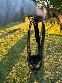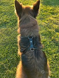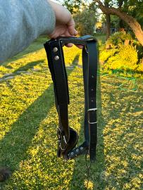 Vendo pettorina in cuoio nera per cani di media/grande taglia, in perfette condizioni perché usata pochissimo, la pettorina è regolabile da tutti i lati. è stato fatto un foro nel cuoio aggiungendo uno spago per fissare la parte eccedente del laccio in cuoio se troppo lungo in modo che non dia fastidio al cane, lo spago è comunque rimovibile se non necessario