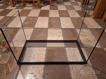 Acquario(con i bordi neri in foto) lungo 59,5 cm, largo 29,5 cm e profondo 35 cm per una capienza circa di 63 litri