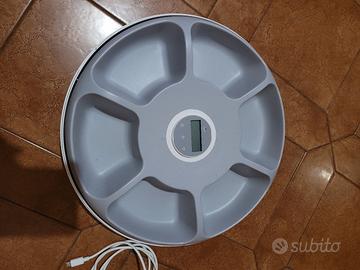 Adatto sia per cibo secco sia umido, per cani o gatti. Display con ora e impostazione della rotazione dei piatti. Dotato del cavo di alimentazione per il collegamento alla corrente elettrica. È predisposto anche per il funzionamento con batterie. Usato ma ancora in ottime condizioni.