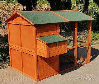 La casetta rialzata è accessibile tramite due scalette e relative aperture. All'interno, è dotata di un posatoio per il riposo notturno, un ripiano estraibile per una facile pulizia del pollaio e un cassettone laterale per la raccolta delle uova. Il tetto a due spioventi è coperto da una pellicola bituminata per proteggere le galline da pioggia e intemperie.