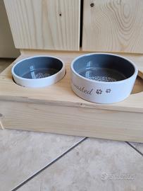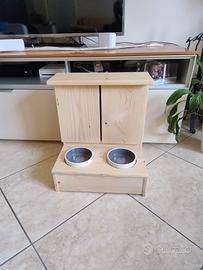 mobiletto per animali in legno per riporre cibo con 2 ciotole in porcellana compresi.