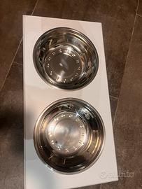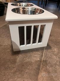 Porta ciotole in legno bianco, con ciotole di acciaio 58x30x25. Arrivato, provato ad usare con il nostro golden ma è piu cocciuta di chiunque e non ne vuole proprio sapere. Quindi vendiamo pari al nuovo. Pagato 45€ su amazon vendiamo a 30€