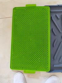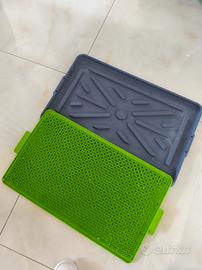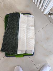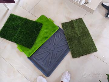 tappeto con base di plastica dura e copri coperchio con fori per drenaggio, che si possono lavare e disinfettare completo di due tappeti di erba sintetica per favorire i bisogni del cagnolino di può mettere un traversino in mezzo per evitare che la pipì vada nella base comodissimo se dovete uscire o per la notte per soddisfare i bisogni del vostro amico a 4 zampe