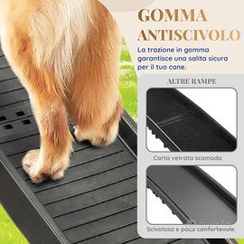 SUPERFICIE ANTISCIVOLO IN GOMMA – SICURA ANCHE BAGNATA: Superficie in gomma ad alta aderenza per una presa sicura e confortevole, anche con le zampe bagnate. Piedini in gomma su entrambe le estremità evitano lo scivolamento a terra o sull’auto. Ideale per cani grandi o anziani.