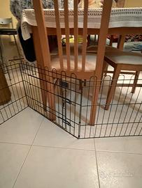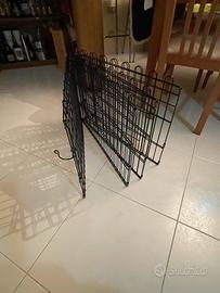 In ferro scuro e pieghevole grazie a delle cerniere. Dotata di cancelletto. Si richiude facilmente e si blocca con un gancio e ha una maniglia per agevolarne il trasporto.
