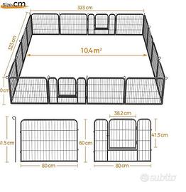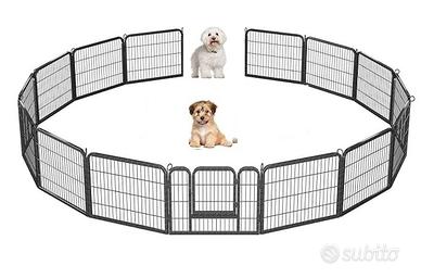 Vendo recinto per animali con nr. 15 pannelli misura 80x60 cm compreso di una porta apribile. Va bene sia per interno che per esterno. E’ in ferro con rete metallica. Adatti per Cani, Gatti, Conigli e Cuccioli . Recinzione robusta e stabile. Facile da montare. Il recinto si puo’ montare in lunghezza, larghezza e rotondo a secondo della scelta. Vendo per inutilizzo Euro 70,00